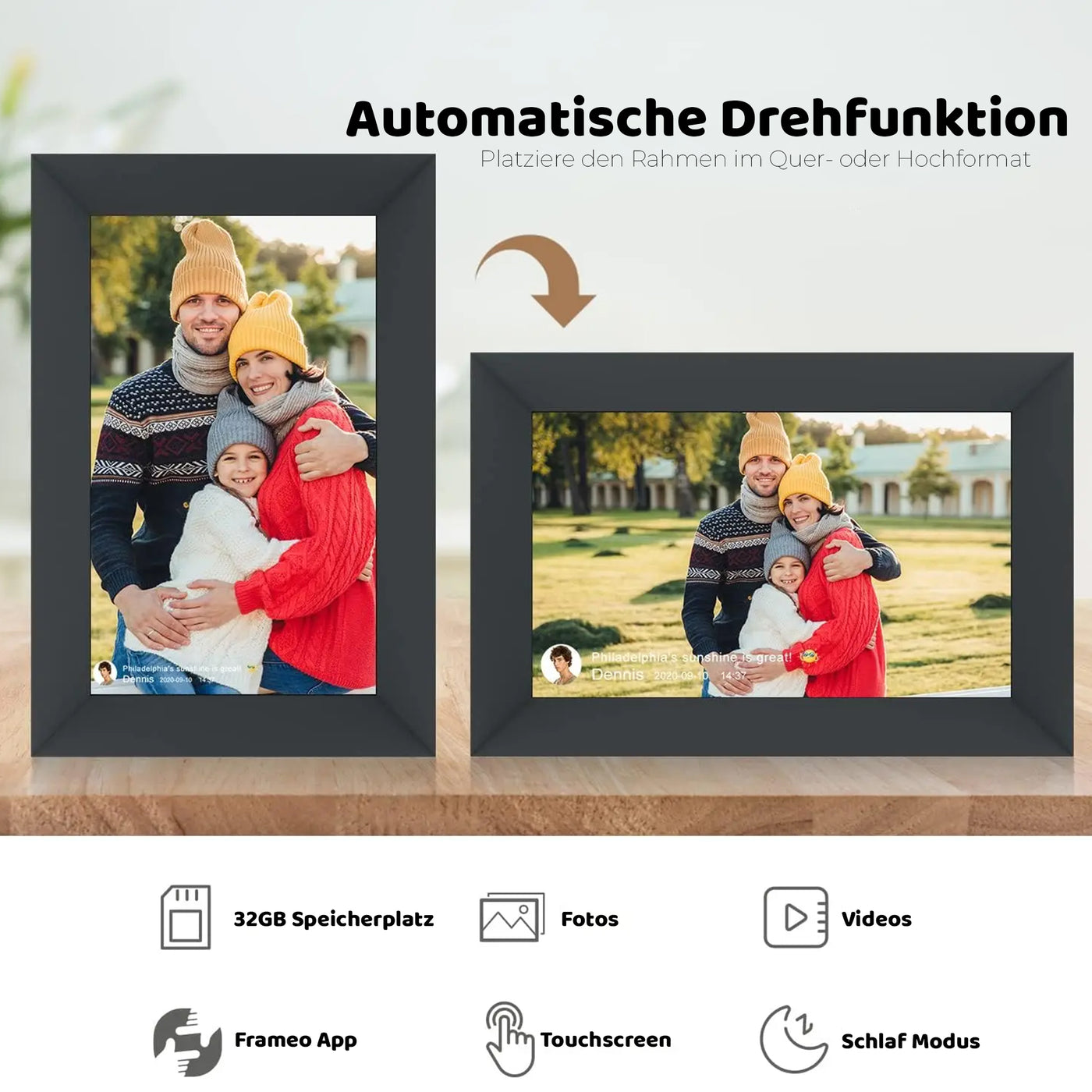 Nie wieder verpasste Familienmomente! Mit dem Filapen WLAN-Bilderrahmen kannst du Fotos und Videos weltweit in Echtzeit teilen – direkt über die kostenlose App. Ob Familie, Freunde oder Partner: Alle sehen deine schönsten Augenblicke sofort, gestochen scharf auf dem 10,1-Zoll-HD-Touchdisplay mit Ton. Dank automatischer Drehfunktion, 32 GB Speicher und SD-Slot ist der Rahmen vielseitig und jederzeit einsatzbereit. Modernes Design trifft einfache Bedienung – ein Geschenk, das verbindet und Erinnerungen lebendig macht.