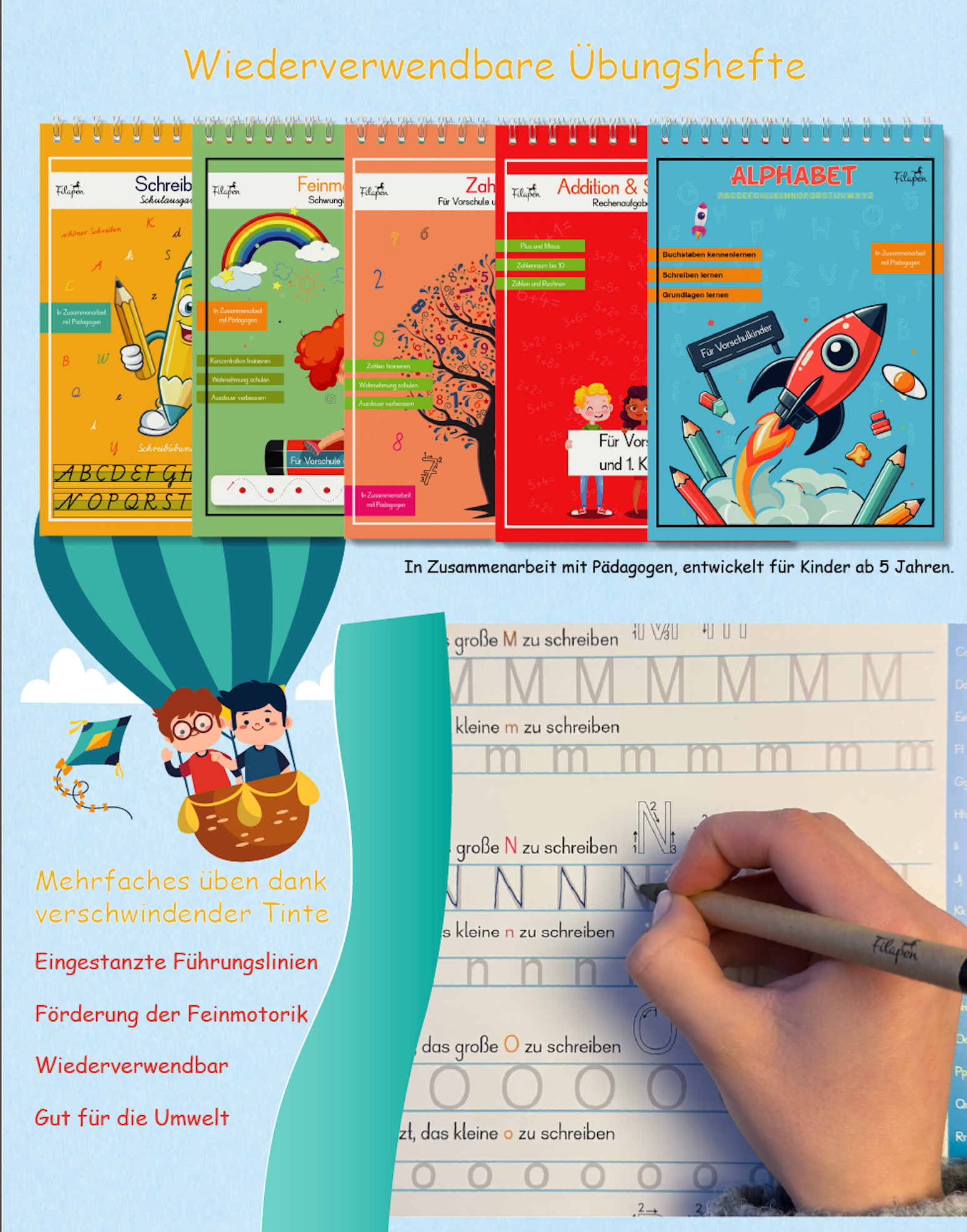 Die magischen Übungshefte von FilaPen begleiten Vorschul- und Grundschulkinder beim spielerischen, nachhaltigen Lernen. Dank der Zaubertinte kann dein Kind immer wieder schreiben, denn die Schrift verschwindet nach 20 Minuten von selbst und das Heft ist sofort wieder bereit für die nächste Übungsrunde. Mit fünf verschiedenen Modulen werden alle wichtigen Lernbereiche abgedeckt. Die eingestanzten 3D-Führungslinien helfen dabei, die richtige Haltung und den richtigen Druck beim Schreiben zu erlernen. Entwickelt von Pädagogen nach deutscher Norm und bereits über 200.000 Kinder lernen glücklich mit unseren Heften.