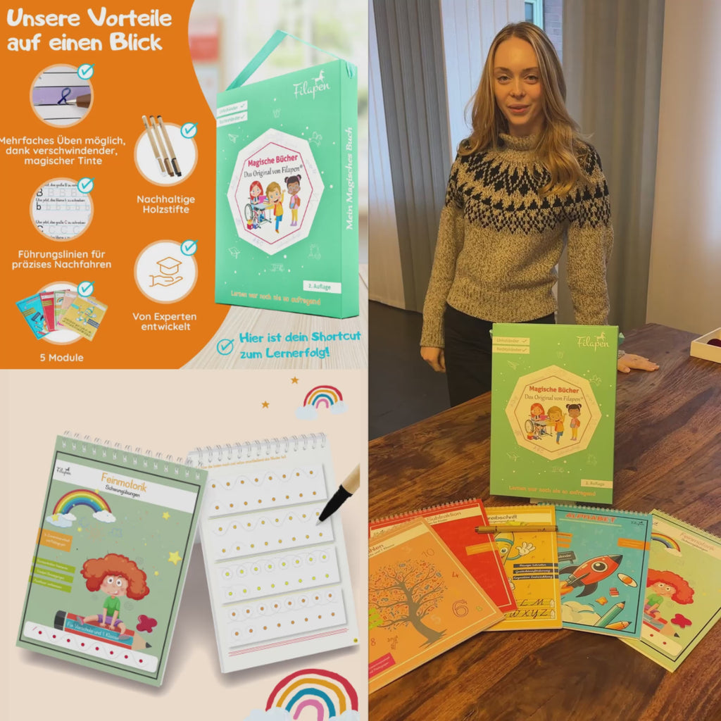 Die Magischen Übungshefte von Filapen verbinden Lernen mit Spaß – in fünf abwechslungsreichen Modulen: Alphabet, Schreibschrift, Zahlen, Addition & Subtraktion und Motorik. Die Schrift entspricht der in Deutschland gelehrten Originalschrift – ideal zur optimalen Vorbereitung auf die Schule. Spielerisch werden wichtige Grundlagen, Kreativität und Konzentration gefördert – für echte Lernerfolge mit Freude statt Frust!